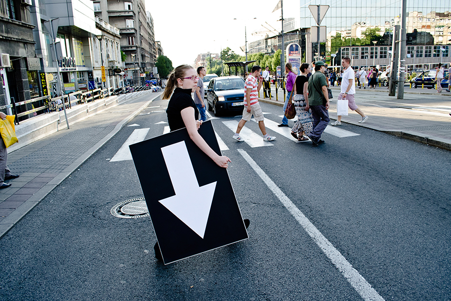Obzirom na sve veću pokrivenost grada kamerama za nadzor, vidljivost postaje činjenica svakodnevnog života. Tehnika omogućava da se priključimo tim kamerama, da osmatramo većinu lokacija u gradu, ali i da rezultate tog posmatranja zabeležimo i sačuvamo. Fotografije koje prate performans nastale su upravo fotografisanjem javnih prostora priključivanjem kamerama za nadzor, zajedno sa fotografijama iz fotoaparata kojima se dokumentuje proces fotografisanja. Članovi grupe UMETNIK* odlučuju da kroz novi medij fotografišu sebe dok izvode performans. Svesni fiksirane kamere iznad grada, prilagođavaju se prethodno određenom kadru i rakursu, gde ipak ima mesta za izbor trenutka fotografisanja. Intervencija u vidu strelice kao dodatnom upućivanju na sebe, omogućava lakše sagledavanje u nepreglednoj i neselektivnoj vidljivosti. Da li to što kamere omogućavaju vidljivost zaista doprinosi vidljivosti, i kome doprinosi? Strelica je usmerena tako da signalizuje članove grupe UMETNIK*, dok kamera pokazuje položaj i prostor koji Umetnik danas zauzima. Ukazivanjem na mesto Umetnika postavlja se pitanje njegove vidljivosti – da li se on vidi i da li se može videti bez dodatnih obeležja koja ukazuju na njegov status. Preispitivanje statusa i uloge Umetnika dodatno se potencira samoinicijativnim fotografisanjem bez mogućnosti uticaja na izgled fotografije u smislu tehničkih mogućnosti kamere za nadzor, što rezultira fotografijom koja oslikava kako Umetnik izgleda u javnosti.